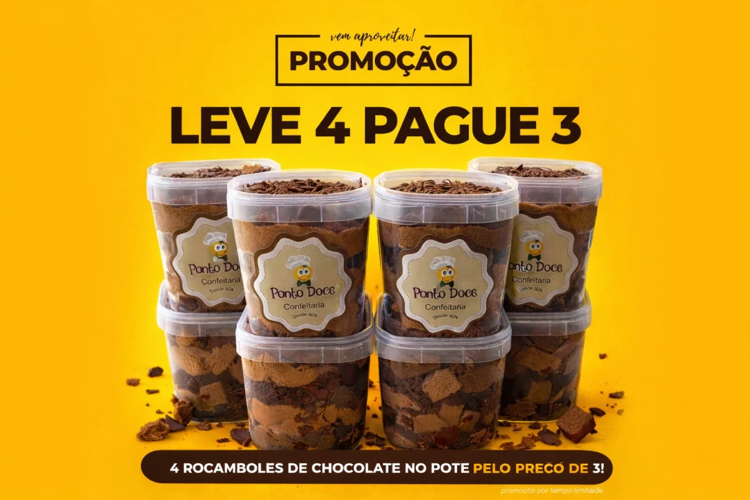 Leve 4 unidades do nosso Rocambole de Chocolate no Pote e pague apenas 3! Mais chocolate, mais sabor e mais economia. Promoção por tempo limitado Ideal para compartilhar (ou não)