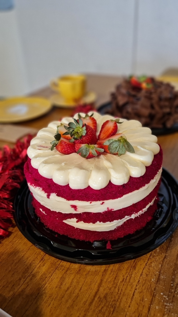 Torta Red Velvet com creme de cream cheese de branquinho e frutas vermelhas.